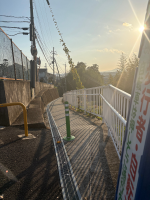 - 321号線の横断歩道を渡り、道路わきの下り坂に入ります。--- A